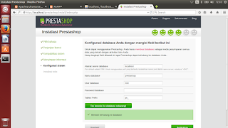 Setelah berhasil masuk kehalaman utama PHPMyAdmin, buatlah sebuah database yang nantinya akan digunakan pada instalasi Prestashop. Disini saya membuat database dengan nama prestashop.Langkah selanjutnya instalasi Prestashop. - Instalasi Prestashop. Login sebagai root dengan mengetikkan perintah su atau sode sutiasamarwati@tiasamarwati-NEON-TNN:~$ sudo su[sudo] password for tiasamarwati:root@tiasamarwati-NEON-TNN:/home/tiasamarwati#kemudian kopikan file Prestashop dari /home/user-anda le root web anda. Pastikan anda telah menginstal dan menjalankan aplikasi server. Pada postigan kali ini menggunakan XAMPP Linux dengan root web di /opt/lampp/htdocs. Berikut syntak perintah yang digunakan.root@tiasamarwati-NEON-TNN:~# cp /home/tiasamarwati/prestashop_1.6.0.5.zip /opt/lampp/htdocssetelah proses pengkopian selesai ankah selanjutnya pindah ke lokasi folder root web anda dengan syntak berikut ini.root@tiasamarwati-NEON-TNN:~# cd /opt/lampp/htdocs/cek kembali lokasi dimana anda berada saat ini(Linux) dengan syntak berikut.root@tiasamarwati-NEON-TNN:~# pwdmaka akan muncul/opt/lampp/htdocs